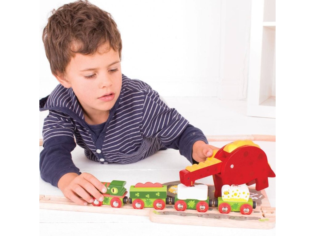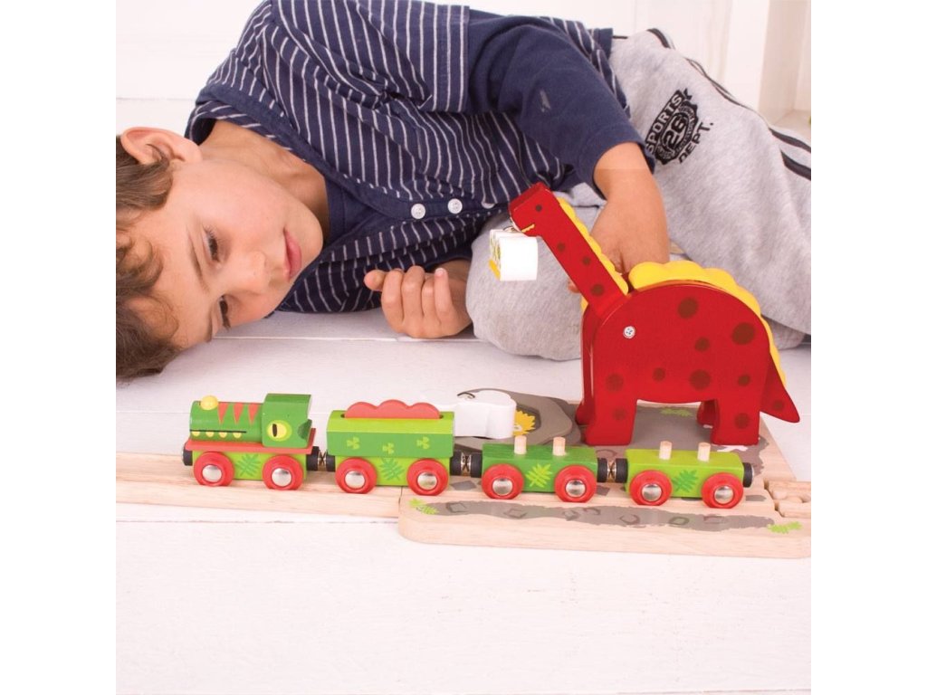 Fantasy dinosauří příslušenství vláčkodráhy, ve kterém se vzrušující svět železnice a prehistorické dinosauři doby spojili v jedno. Tento pohádkový dino jeřáb kombinuje tradiční funkci s prehistorickým designem. Děti mohou snadno přepravit dinosauří vejce na vagónek pomocí pohyblivého krku dinosaura a jeho magnetických úst. Balení obsahuje: základnu, dinosaura, 1 ks vagónek na nasazování. Hlavní vlastnosti: vláčkodráhy a jejich příslušenství značky Bigjigs Rail je možno kombinovat se všemi dalšími dřevěnými vláčkodráhami na trhuvyrobeno z kvalitních a zodpovědně získaných přírodních materiálůodpovídá současným evropským bezpečnostním normámpodporuje představivost, obratnost a koordinaciDoplňkové parametry