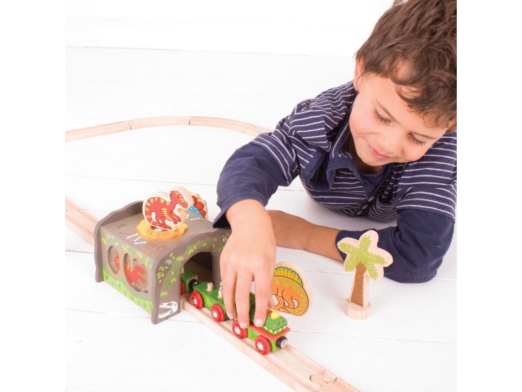 Fantasy dinosauří příslušenství vláčkodráhy, ve kterém se vzrušující svět železnice a prehistorické dinosauři doby spojili v jedno. Tunel přenáší děti do vzrušujícího světa fantazie, když se odváží projet svými vlaky děsivým tunelem a musí se vyhnout divokému T. rexovi a pterodactylovi strážící své hnízdo. Součástí balení je fialový pterodactyl. Hlavní vlastnosti: vláčkodráhy a jejich příslušenství značky Bigjigs Rail je možno kombinovat se všemi dalšími dřevěnými vláčkodráhami na trhu.vyrobeno z kvalitních a zodpovědně získaných přírodních materiálů.odpovídá současným evropským bezpečnostním normám.podporuje představivost, obratnost a koordinaci.Doplňkové parametry