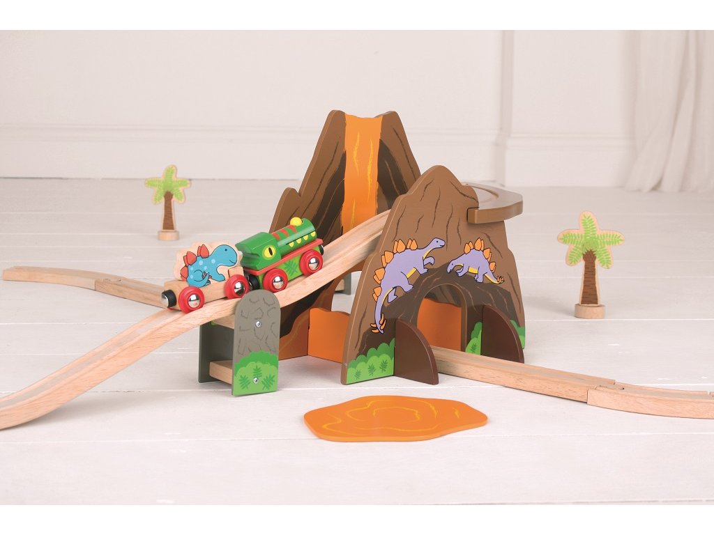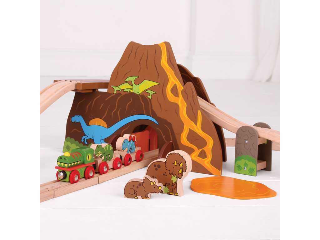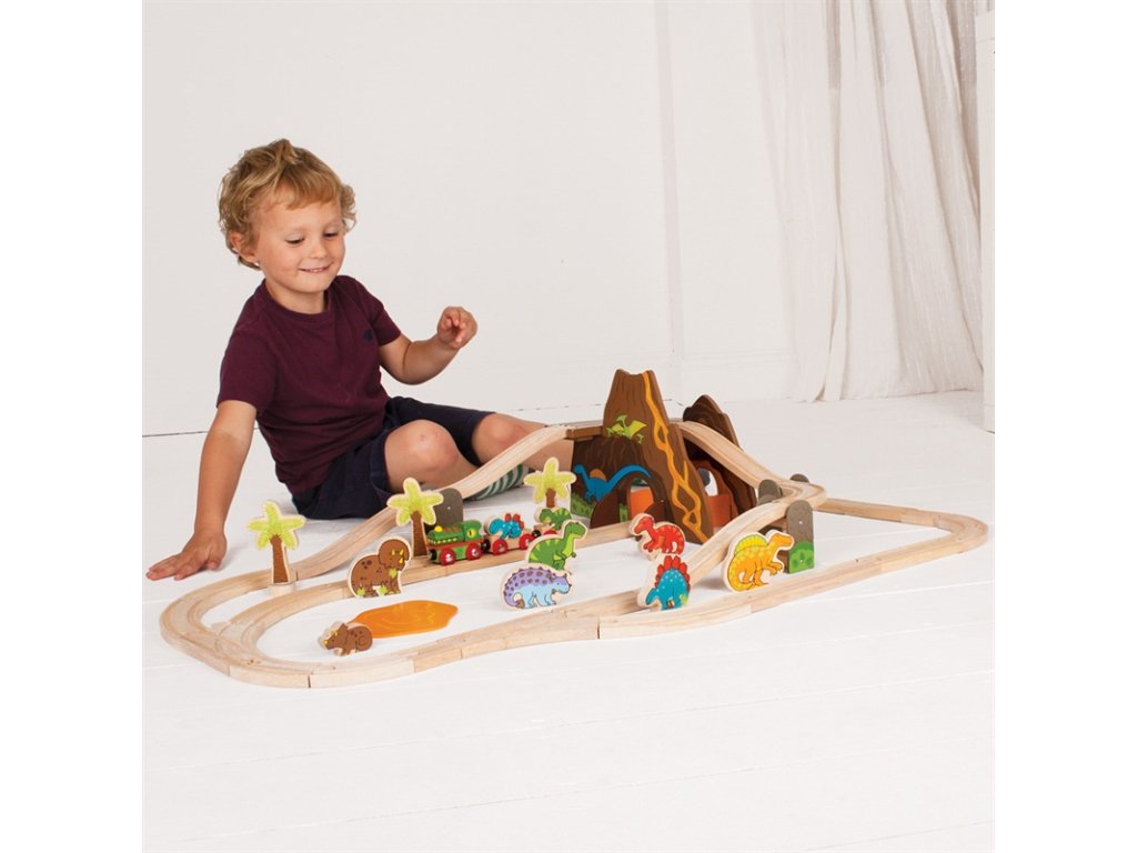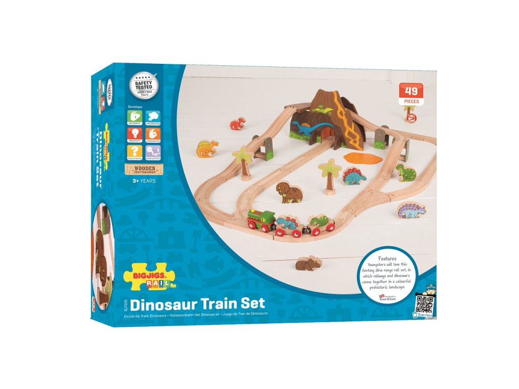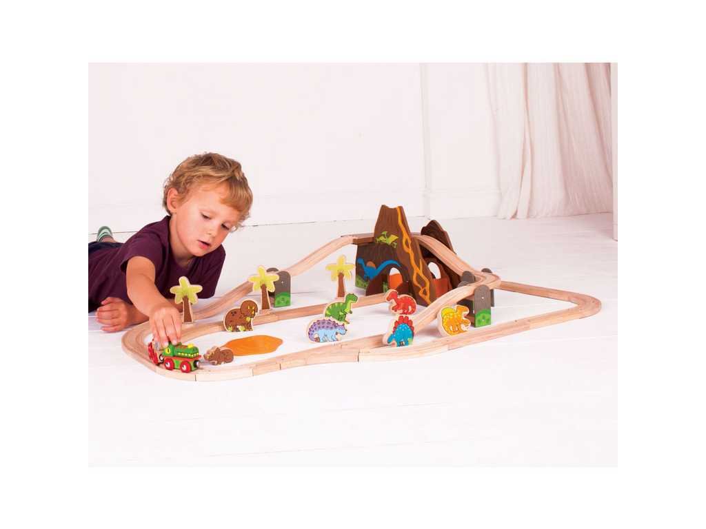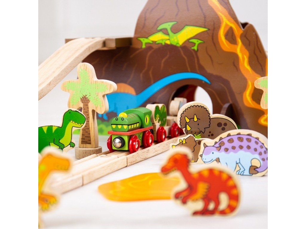 Sada obsahuje 49 dílků. Fantasy dinosauří set vláčkodráhy, ve kterém se železnice a dinosauři spojili v barevnou pravěkou krajinu. Set obsahuje dinosauří vlak, sopku s tunelem a skupinu dřevěných dinosaurů. Tuto sadu lze rozšířit o další dinosauří příslušenství. Hlavní vlastnosti: vláčkodráhy a jejich příslušenství značky Bigjigs Rail je možno kombinovat se všemi dalšími dřevěnými vláčkodráhami na trhuvyrobeno z kvalitních a zodpovědně získaných přírodních materiálůodpovídá současným evropským bezpečnostním normámpodporuje představivost, obratnost a koordinaciDoplňkové parametry