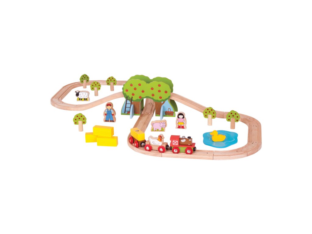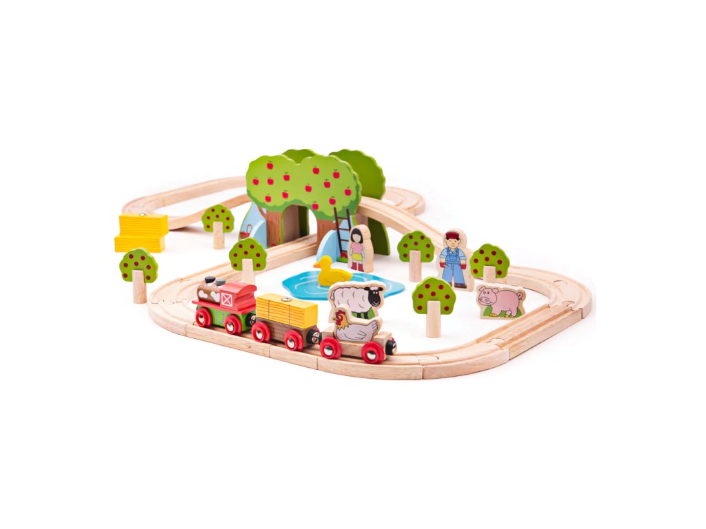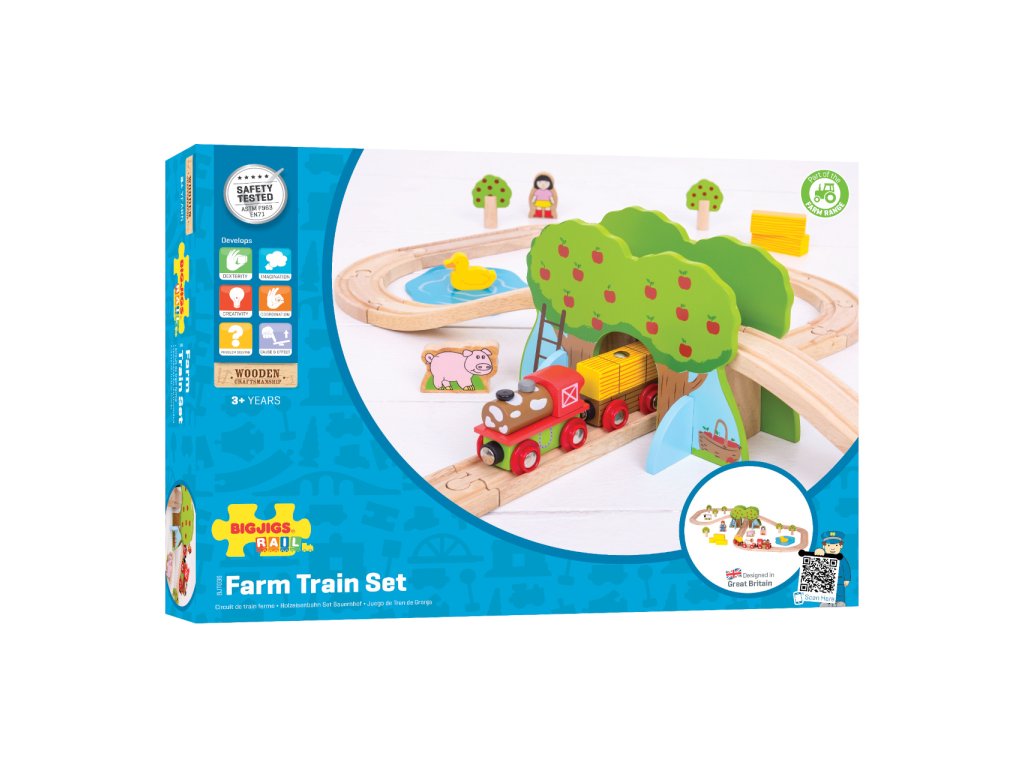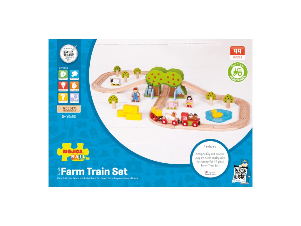 Sada se skládá z 45 dílků. Krásná vláčkodráha v motivu farmy s postavičkami lidí, zvířat, stromů... Hlavní vlastnosti: vláčkodráhy a jejich příslušenství značky Bigjigs Rail je možno kombinovat se všemi dalšími dřevěnými vláčkodráhami na trhuvyrobeno z kvalitních a zodpovědně získaných přírodních materiálůodpovídá současným evropským bezpečnostním normámpodporuje představivost, obratnost a koordinaciDoplňkové parametry