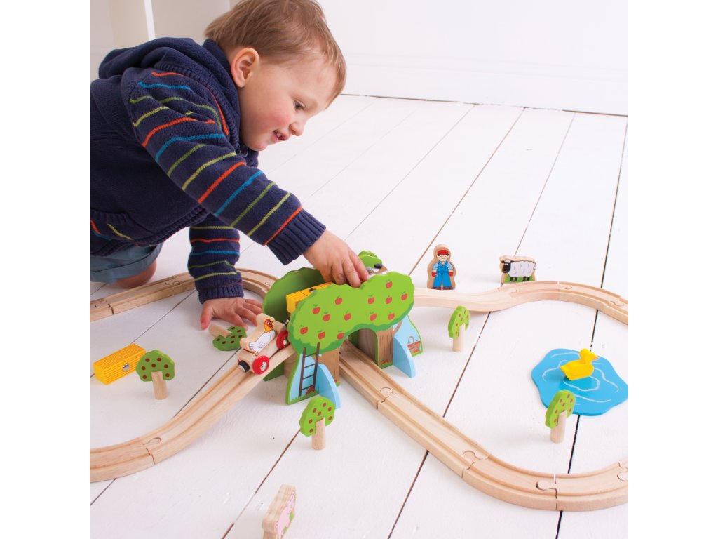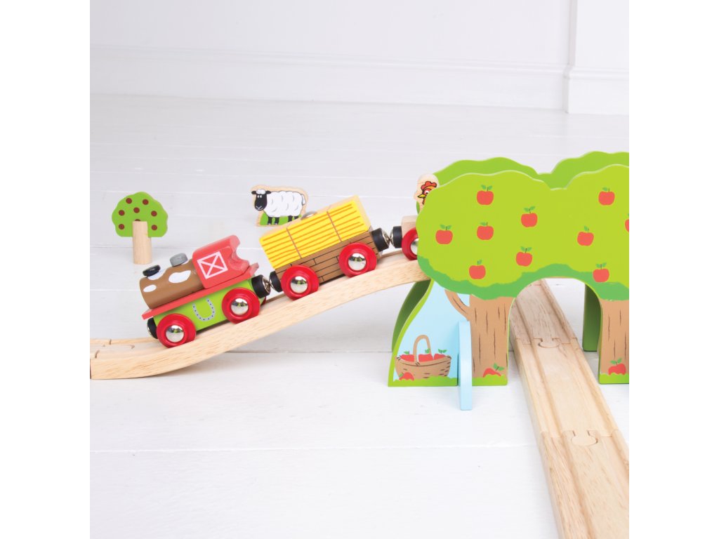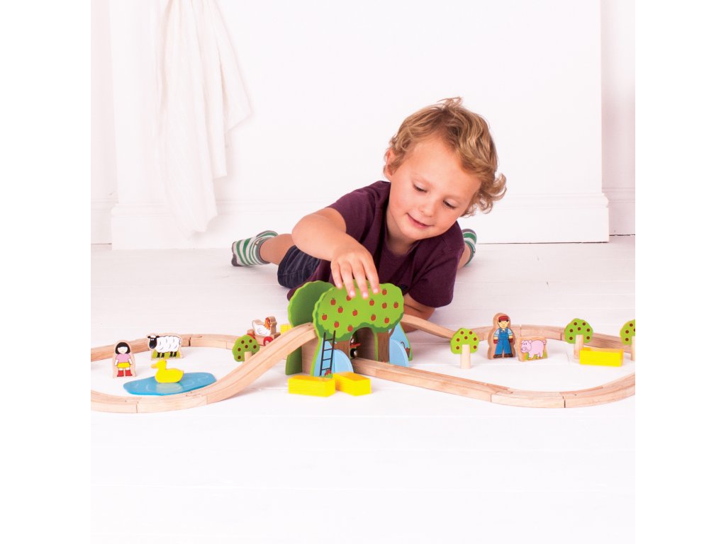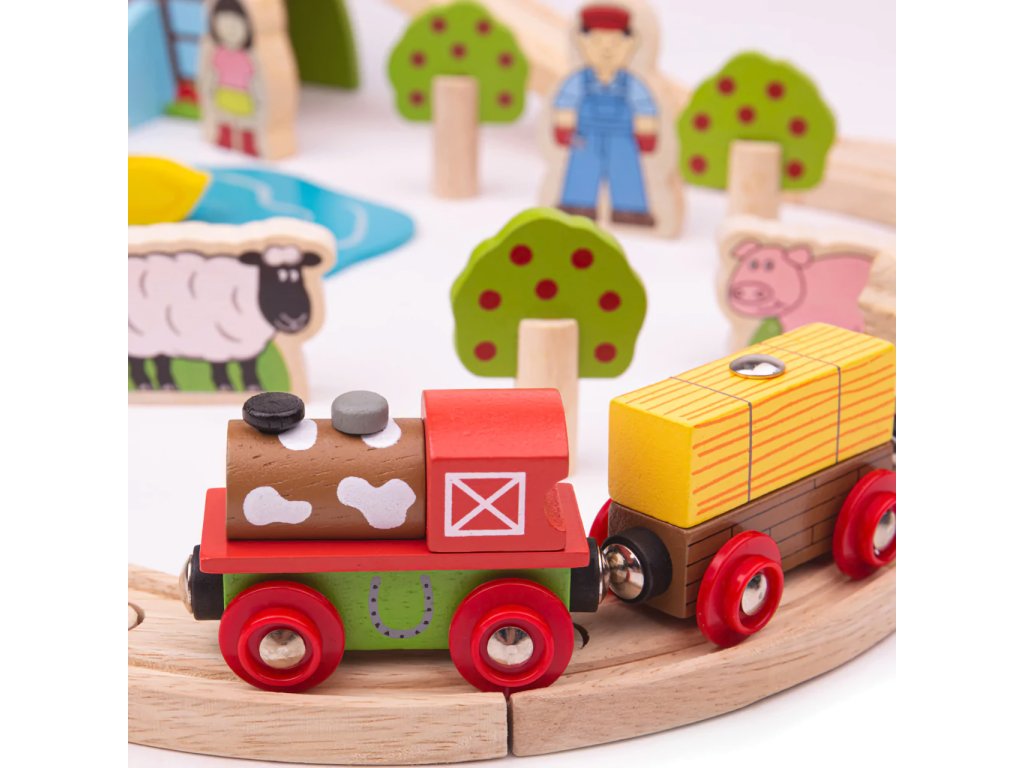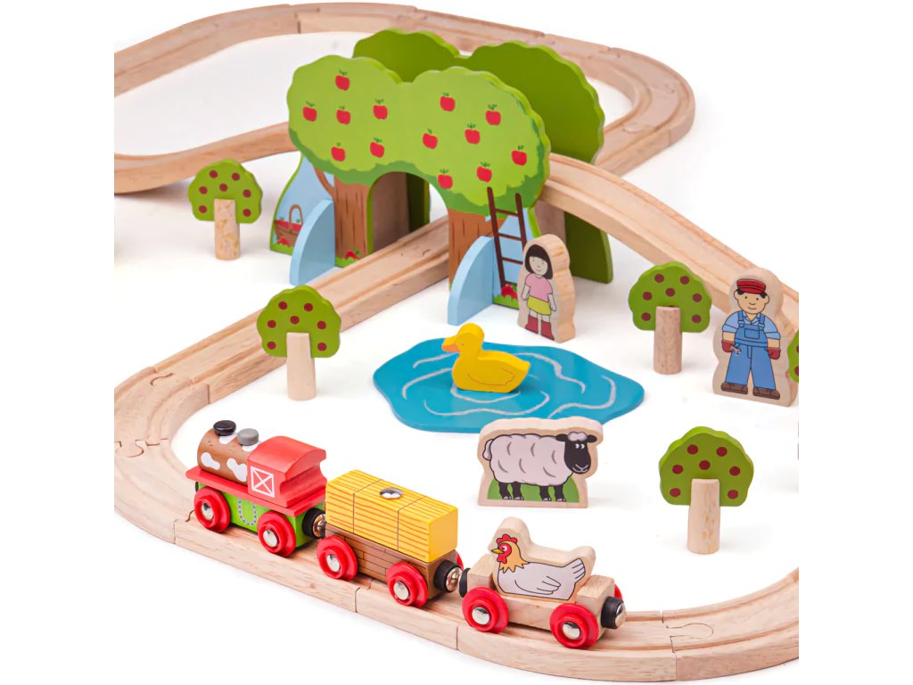 Sada se skládá z 45 dílků. Krásná vláčkodráha v motivu farmy s postavičkami lidí, zvířat, stromů... Hlavní vlastnosti: vláčkodráhy a jejich příslušenství značky Bigjigs Rail je možno kombinovat se všemi dalšími dřevěnými vláčkodráhami na trhuvyrobeno z kvalitních a zodpovědně získaných přírodních materiálůodpovídá současným evropským bezpečnostním normámpodporuje představivost, obratnost a koordinaciDoplňkové parametry