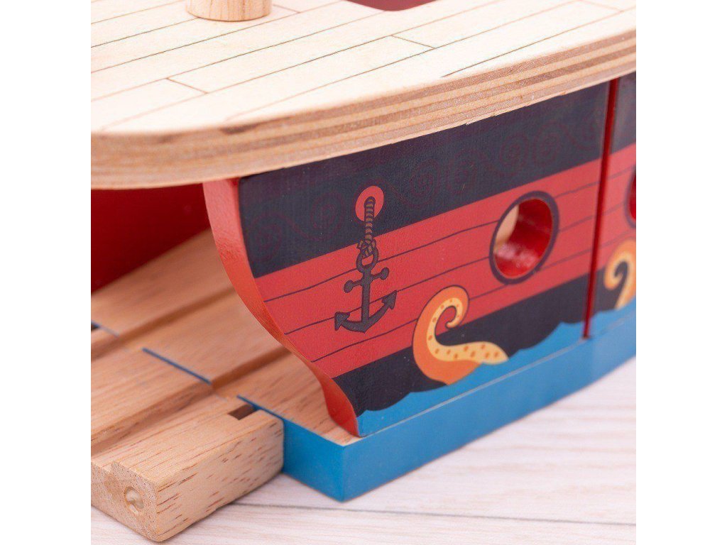 Ahoj! Tato dřevěná pirátská galéra krásně doplní vaši vláčkodráhu. Děti mohou sledovat vláček v podpalubí skrz kruhová okénka. Až budete připraveni odplout, jednoduše zavřete pružné kolejové díly na obou koncích lodě. Moře je plné chobotnic, vyhněte se jim a užijte si mnoho pirátské zábavy. Tato dřevěná loď rozvíjí dětskou představivost, zručnost a koordinaci. Pevná a odolná pirátská loď děti pobídne k představivé hře. Vyrobeno z kvalitních materiálů ze zodpovědných zdrojů. Splňuje evropské bezpečnostní standardy. Hlavní vlastnosti: dřevěná pirátská loď se hodí k vláčkodráhámvláčkodráhy a jejich příslušenství značky Bigjigs Rail je možno kombinovat se všemi dalšími dřevěnými vláčkodráhami na trhuvyrobeno z kvalitních a zodpovědně získaných přírodních materiálůpodporuje představivost, zručnost a koordinaciDoplňkové parametry