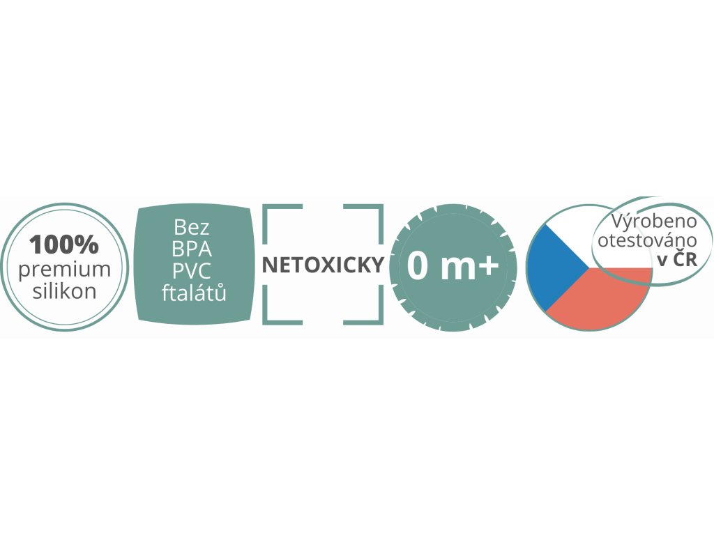 Material: 100% potravinářský silikon bez BPA, PVC a ftalátů, buk, kovový držák, nylonová šňůrka.